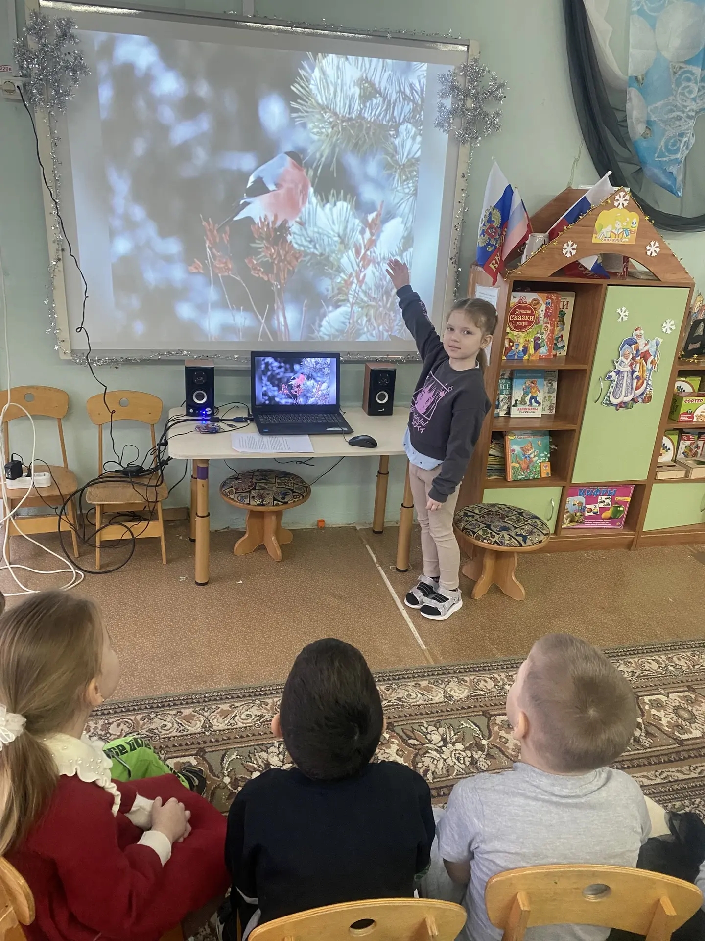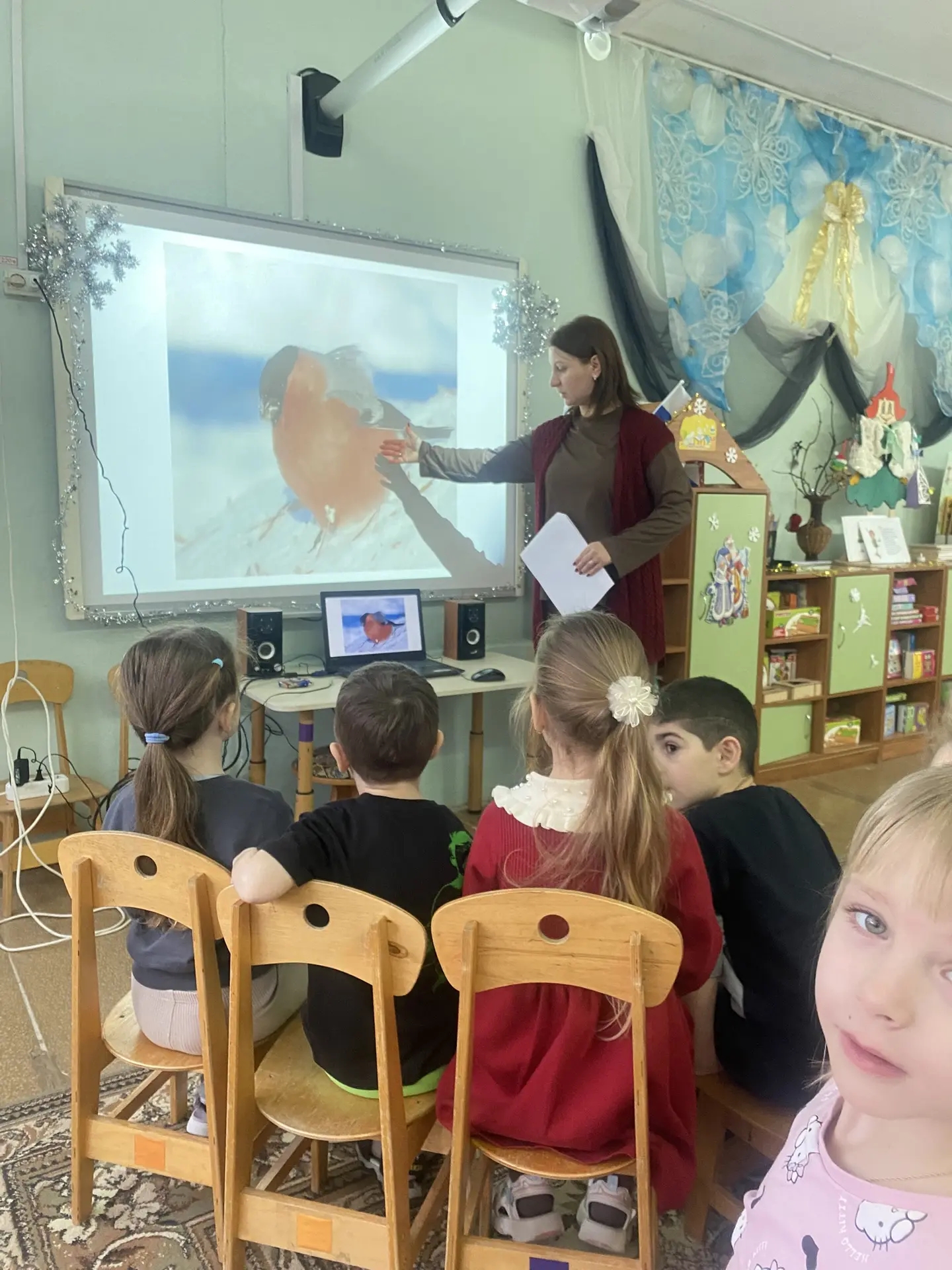 День начался с познавательной беседы о снегирях: дети узнали много интересного о их внешнем виде, повадках, питании и роли в природе. Ребята с интересом слушали рассказ воспитателя и делились своими знаниями о красногрудых гостях наших зим.